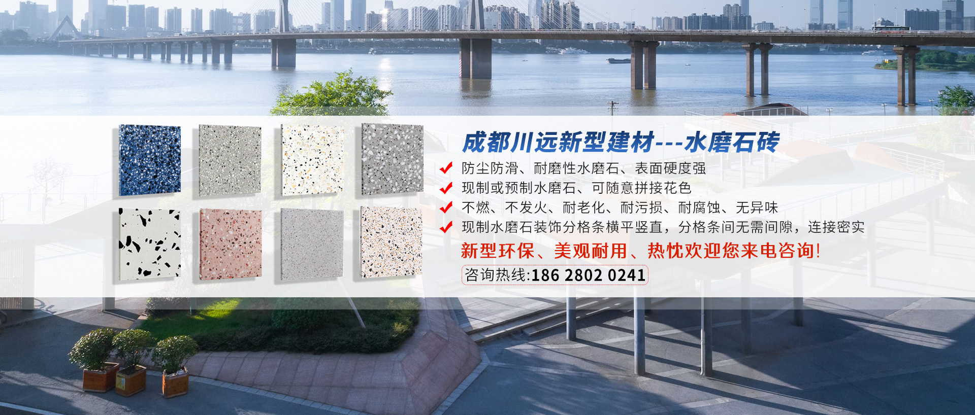 成都川遠新型建材有限公司是一家專業化生產經營透水磚、pc磚定制,仿石材路沿石、水磨石磚的企業。擁有了面積達1000多平方的生產基地,多套完整的大、中型生產設備和眾多專業生產技術人員。本廠生產的各種型號等...